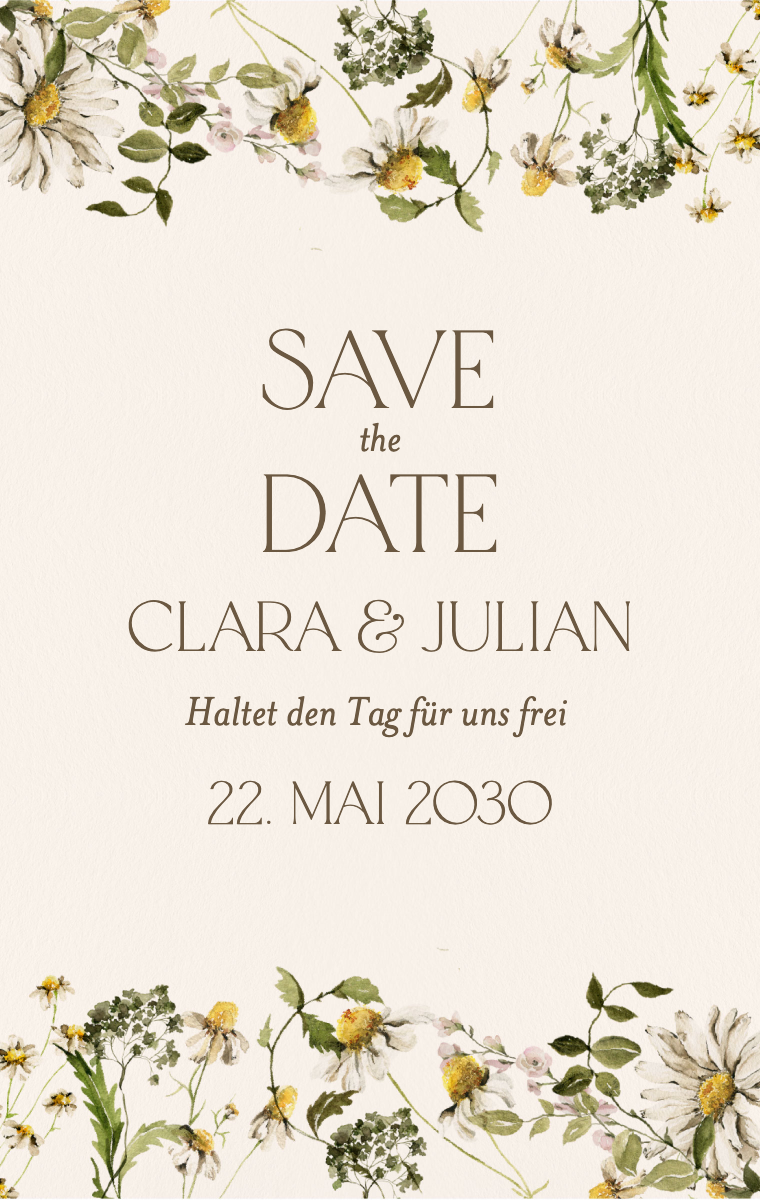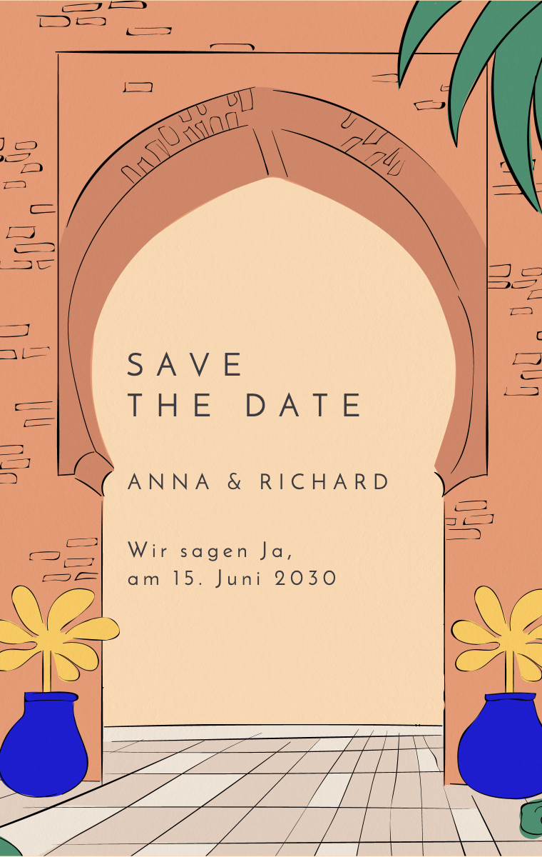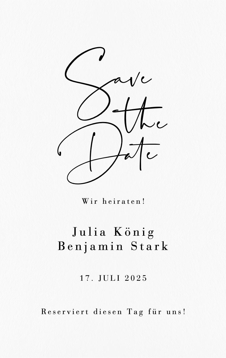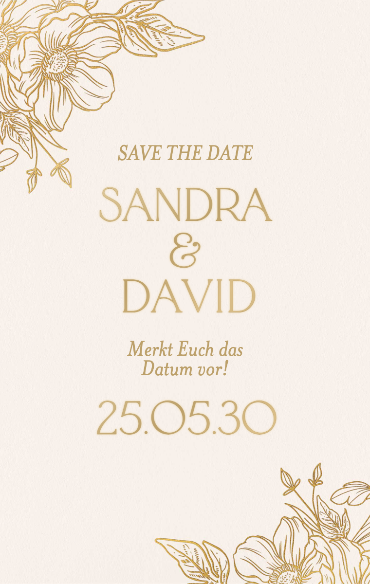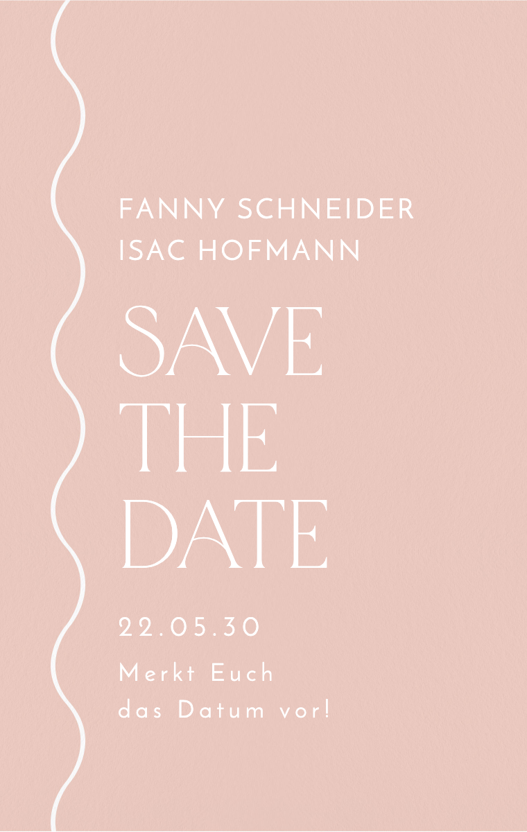 Bereiten Sie Ihren besonderen Tag stilvoll vor! Unsere virtuellen Save The Date Karten sind so gestaltet, dass sie Ihr Hochzeitsdatum elegant und unvergesslich ankündigen. Stellen Sie sicher, dass Ihre Lieben dieses außergewöhnliche Datum jetzt reservieren, mit unseren einfach zu sendenden und zu teilenden Online-Einladungen.