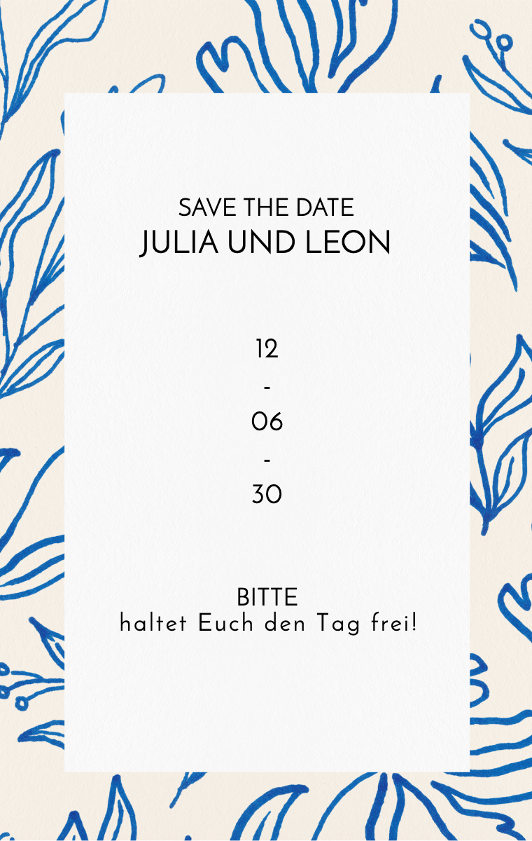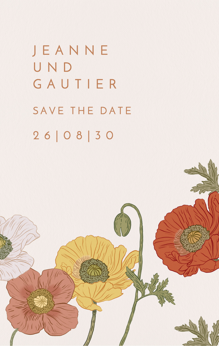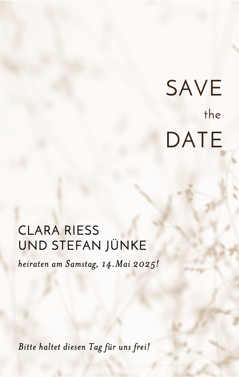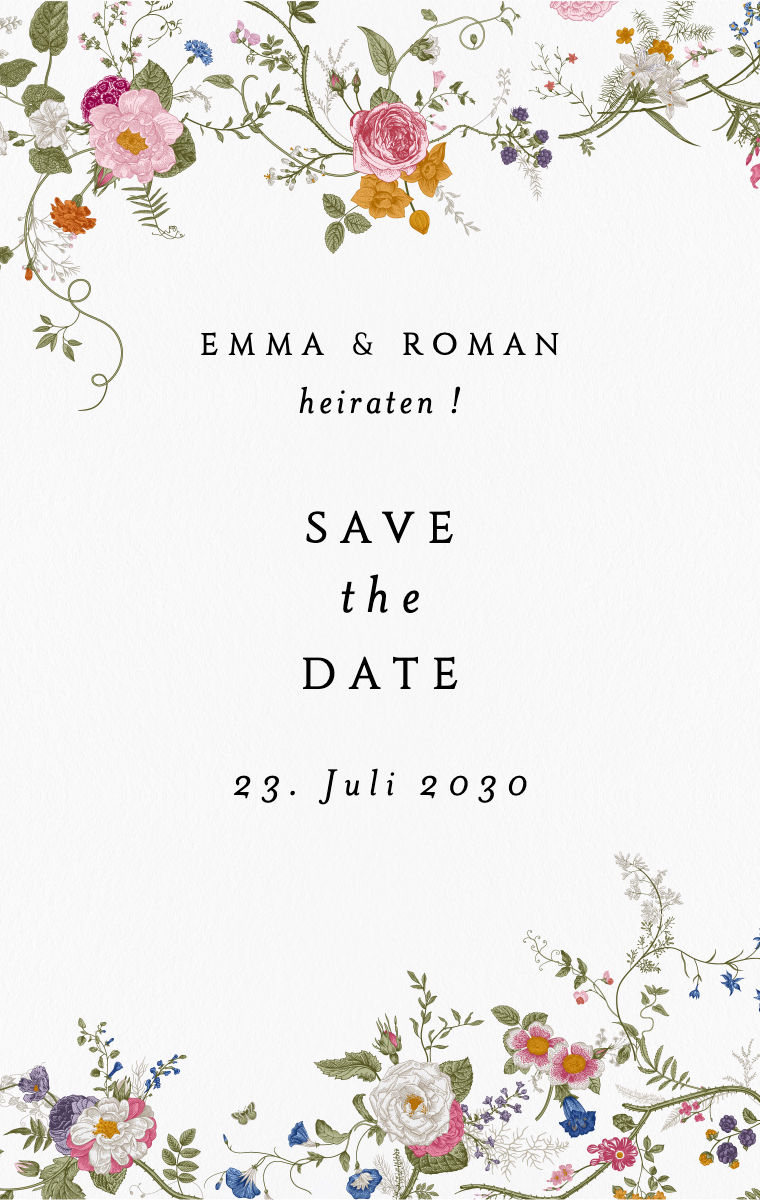 Bereiten Sie Ihren besonderen Tag stilvoll vor! Unsere virtuellen Save The Date Karten sind so gestaltet, dass sie Ihr Hochzeitsdatum elegant und unvergesslich ankündigen. Stellen Sie sicher, dass Ihre Lieben dieses außergewöhnliche Datum jetzt reservieren, mit unseren einfach zu sendenden und zu teilenden Online-Einladungen.