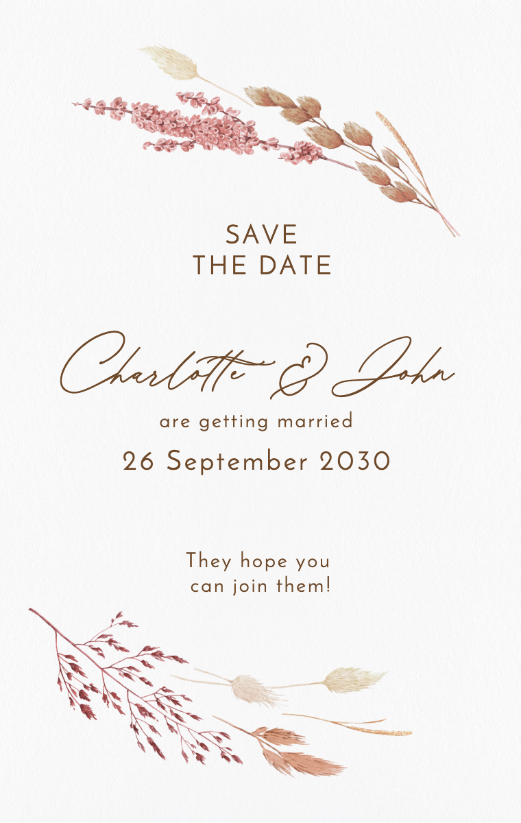 Prepare your special day with style! Our virtual Save The Date cards are designed to announce your wedding date in an elegant and memorable way. Make sure your loved ones reserve this exceptional date now with our easy-to-send and share online invitations.