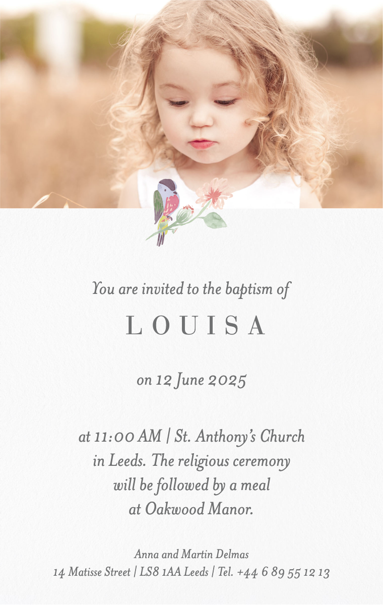 Prepare this special celebration with style! Our virtual baptism invitations are designed to announce your child's baptism date in an elegant and memorable way. Make sure your loved ones save this meaningful moment now with our easy-to-send and share online invitations.