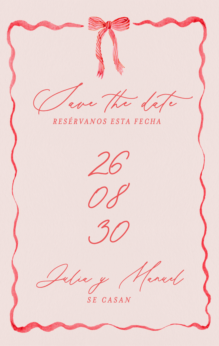 Asegúrate de que tus invitados reserven la fecha de tu boda con un save the date digital. Fácil de enviar y recibir, es el primer paso hacia una celebración exitosa y memorable. Nuestros save the dates digitales pueden personalizarse para que coincidan con el tema de su boda, garantizando la coherencia estética con todas las comunicaciones de tu boda.