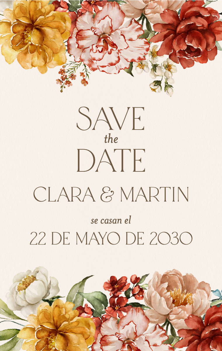 ¡Prepara tu día especial con estilo! Nuestras tarjetas virtuales Save The Date están diseñadas para anunciar la fecha de tu boda de manera elegante e inolvidable. Asegúrate de que tus seres queridos reserven esta fecha excepcional ahora con nuestras invitaciones en línea fáciles de enviar y compartir.