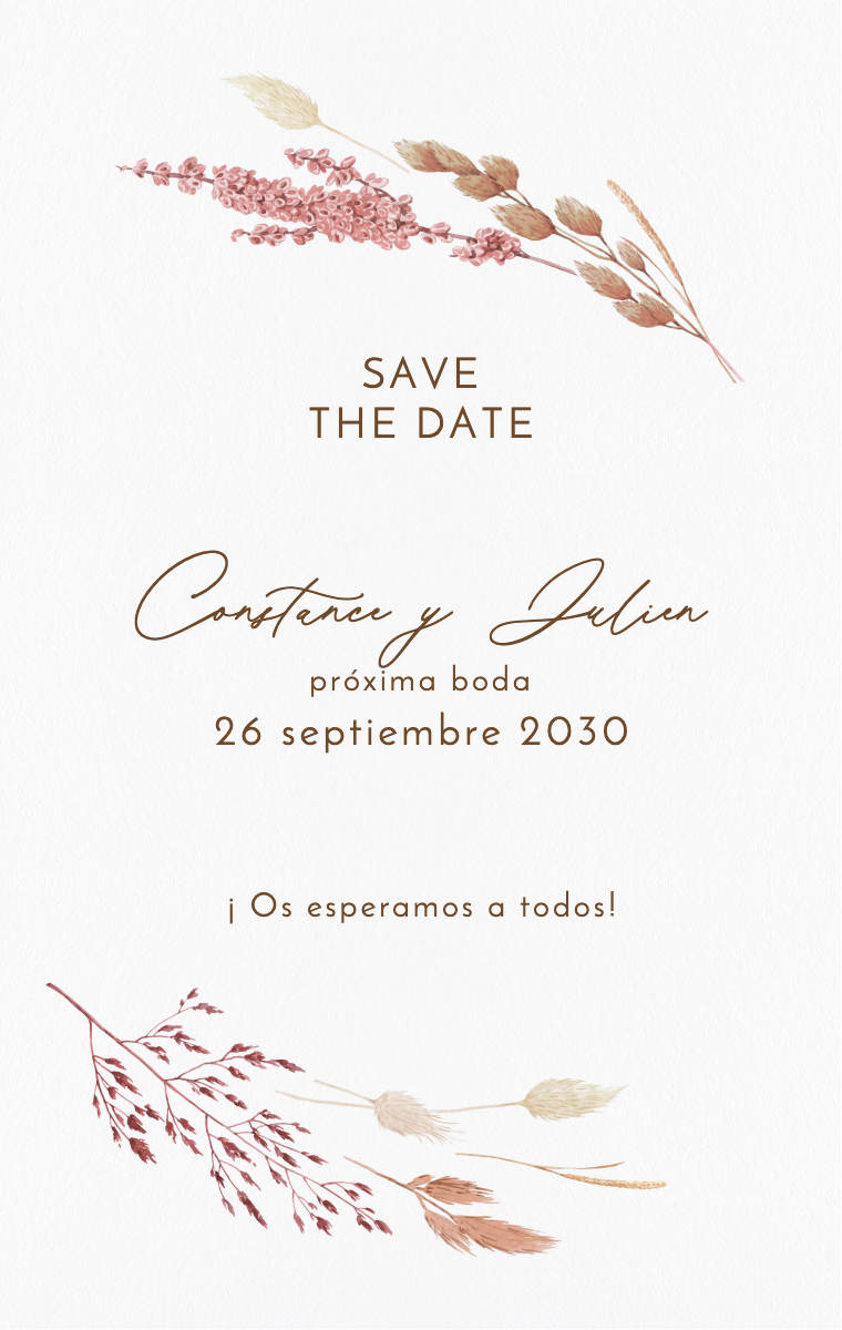 ¡Prepara tu día especial con estilo! Nuestras tarjetas virtuales Save The Date están diseñadas para anunciar la fecha de tu boda de manera elegante e inolvidable. Asegúrate de que tus seres queridos reserven esta fecha excepcional ahora con nuestras invitaciones en línea fáciles de enviar y compartir.