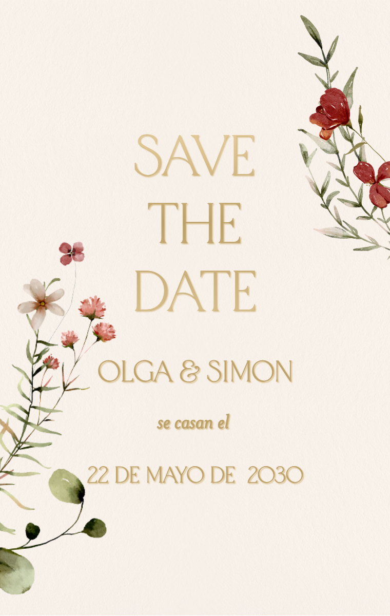 ¡Prepara tu día especial con estilo! Nuestras tarjetas virtuales Save The Date están diseñadas para anunciar la fecha de tu boda de manera elegante e inolvidable. Asegúrate de que tus seres queridos reserven esta fecha excepcional ahora con nuestras invitaciones en línea fáciles de enviar y compartir.