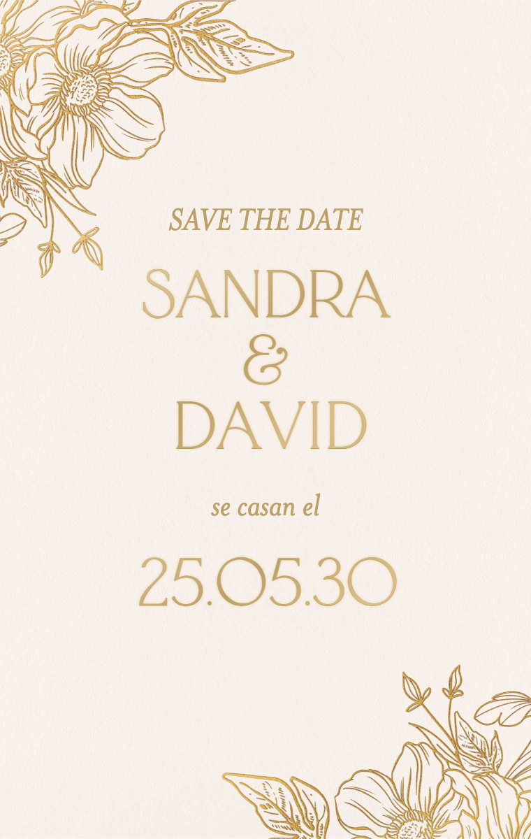 ¡Prepara tu día especial con estilo! Nuestras tarjetas virtuales Save The Date están diseñadas para anunciar la fecha de tu boda de manera elegante e inolvidable. Asegúrate de que tus seres queridos reserven esta fecha excepcional ahora con nuestras invitaciones en línea fáciles de enviar y compartir.