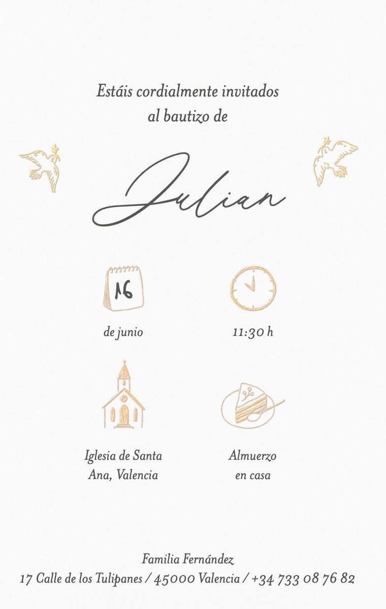 ¡Prepara esta celebración especial con estilo! Nuestras invitaciones virtuales de bautizo están diseñadas para anunciar la fecha del bautizo de tu hijo de manera elegante e inolvidable. Asegúrate de que tus seres queridos reserven este momento único ahora con nuestras invitaciones en línea, fáciles de enviar y compartir.