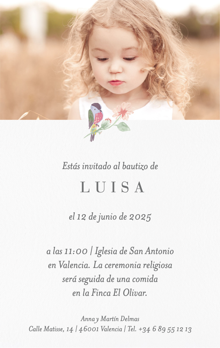 ¡Prepara esta celebración especial con estilo! Nuestras invitaciones virtuales de bautizo están diseñadas para anunciar la fecha del bautizo de tu hijo de manera elegante e inolvidable. Asegúrate de que tus seres queridos reserven este momento único ahora con nuestras invitaciones en línea, fáciles de enviar y compartir.
