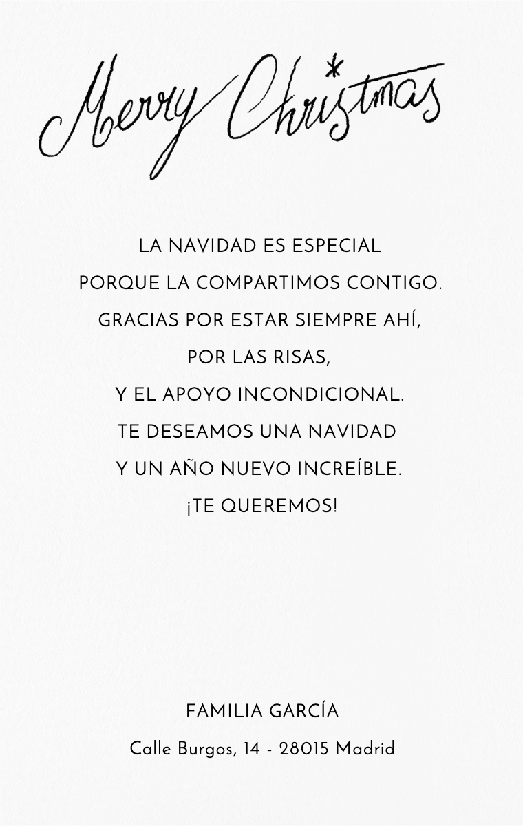 Envía tarjetas de Feliz Año Nuevo digitales y saludos personalizados a tus seres queridos para celebrar la magia de la temporada navideña. Personaliza tus mensajes, añade fotos y comparte tus buenos deseos al instante con amigos y familiares, sin importar dónde se encuentren. Llena su día de alegría con tarjetas de Navidad que puedes enviar por correo electrónico, mensaje de texto o compartir.