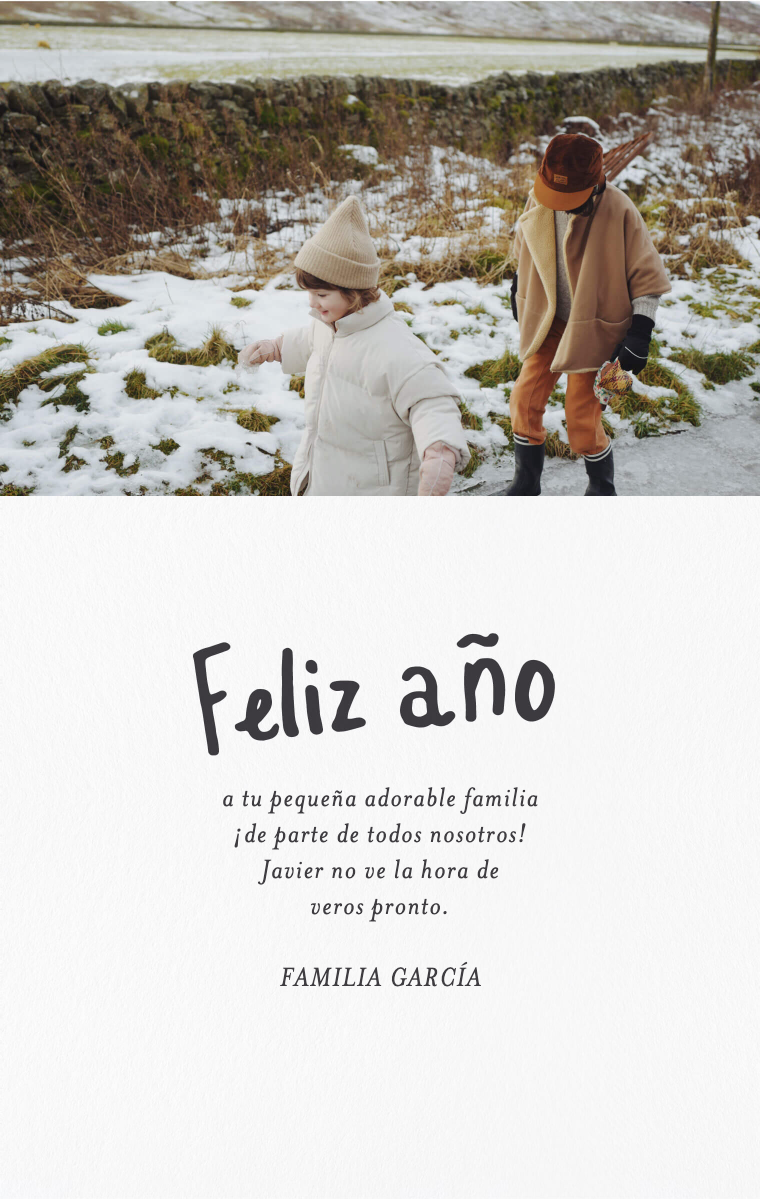 Envía tarjetas de Feliz Año Nuevo digitales y saludos personalizados a tus seres queridos para celebrar la magia de la temporada navideña. Personaliza tus mensajes, añade fotos y comparte tus buenos deseos al instante con amigos y familiares, sin importar dónde se encuentren. Llena su día de alegría con tarjetas de Navidad que puedes enviar por correo electrónico, mensaje de texto o compartir.