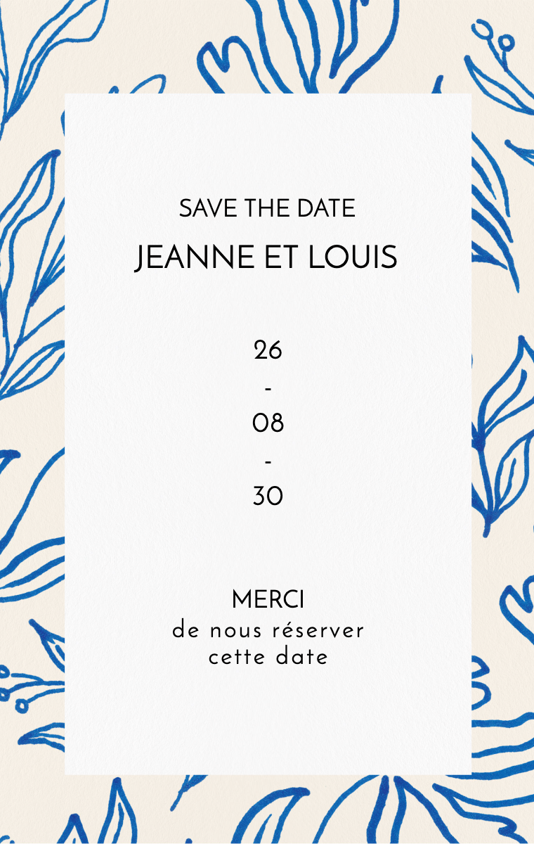 Préparez votre journée spéciale avec style ! Nos cartes Save The Date virtuelles sont conçues pour annoncer la date de votre mariage de manière élégante et mémorable. Assurez-vous que vos proches réservent cette date exceptionnelle dès maintenant avec nos invitations en ligne faciles à envoyer et à partager.