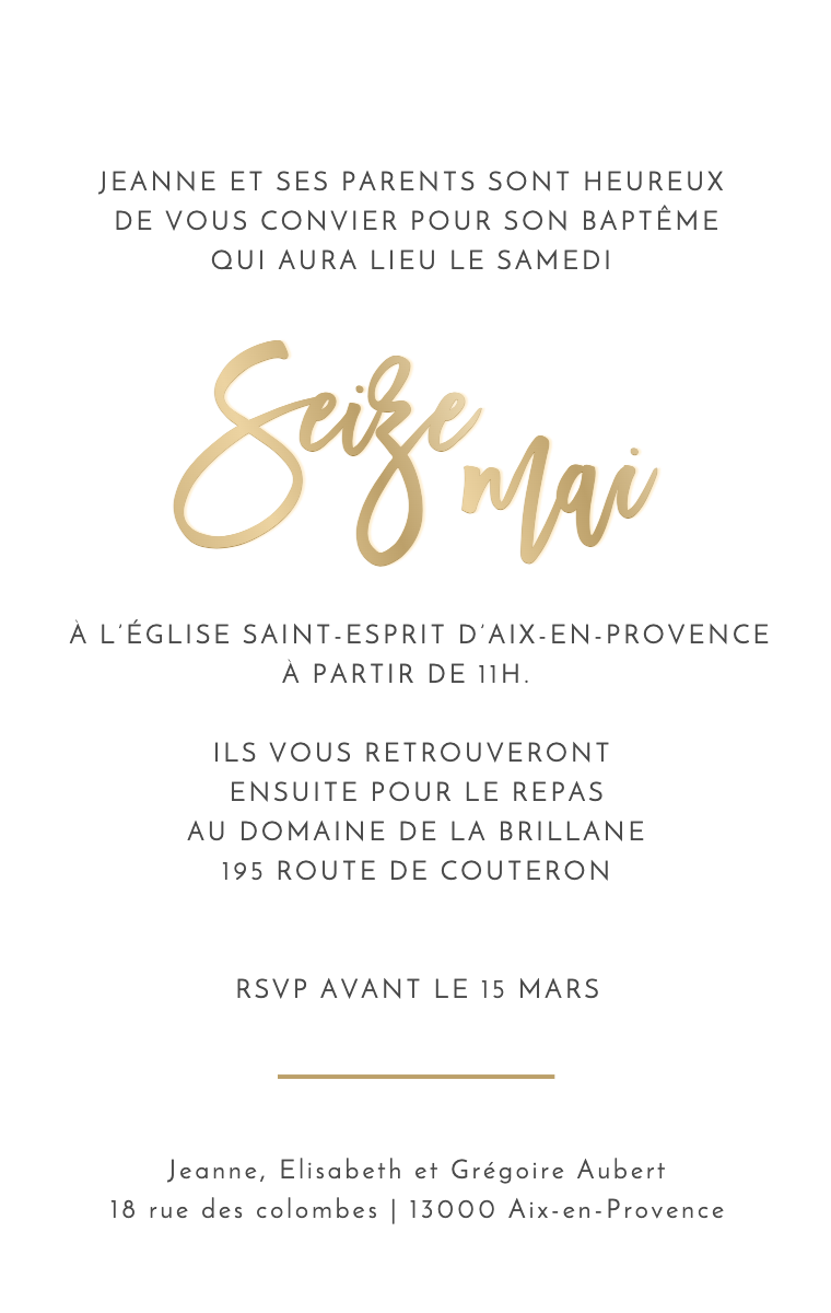 Préparez votre journée spéciale avec style ! Nos cartes d'invitation virtuelles sont conçues pour annoncer la date de son baptême de manière élégante et mémorable. Assurez-vous que vos proches réservent cette date exceptionnelle dès maintenant avec nos invitations en ligne faciles à envoyer et à partager.