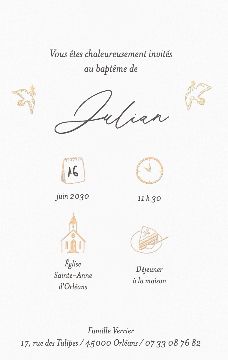 Préparez votre journée spéciale avec style ! Nos cartes d'invitation virtuelles sont conçues pour annoncer la date de son baptême de manière élégante et mémorable. Assurez-vous que vos proches réservent cette date exceptionnelle dès maintenant avec nos invitations en ligne faciles à envoyer et à partager.
