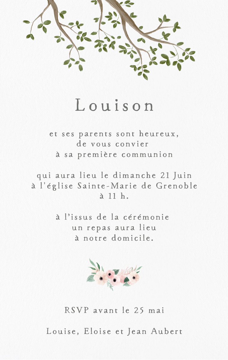 Préparez votre journée spéciale avec style ! Nos cartes d'invitation virtuelles sont conçues pour annoncer la date de sa communion de manière élégante et mémorable. Assurez-vous que vos proches réservent cette date exceptionnelle dès maintenant avec nos invitations en ligne faciles à envoyer et à partager.