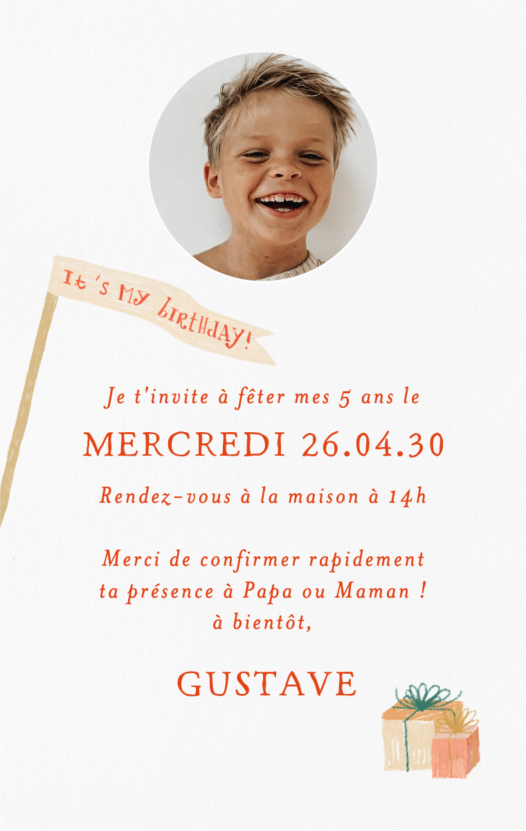 Faites de l'anniversaire de votre enfant un moment magique avec nos invitations virtuelles personnalisées. Des designs colorés et amusants qui donneront le ton pour une fête inoubliable. Invitez vos amis à célébrer avec style et enthousiasme grâce à nos cartes d'invitation en ligne faciles à créer et à distribuer.
