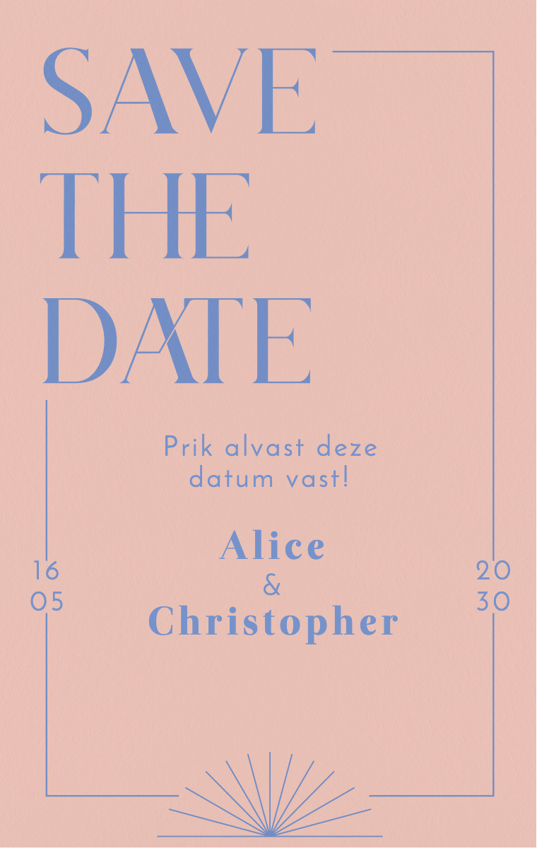 Bereid uw speciale dag stijlvol voor! Onze virtuele Save The Date kaarten zijn ontworpen om uw trouwdatum elegant en gedenkwaardig aan te kondigen. Zorg ervoor dat uw dierbaren deze bijzondere datum nu reserveren met onze gemakkelijk te verzenden en te delen online uitnodigingen.