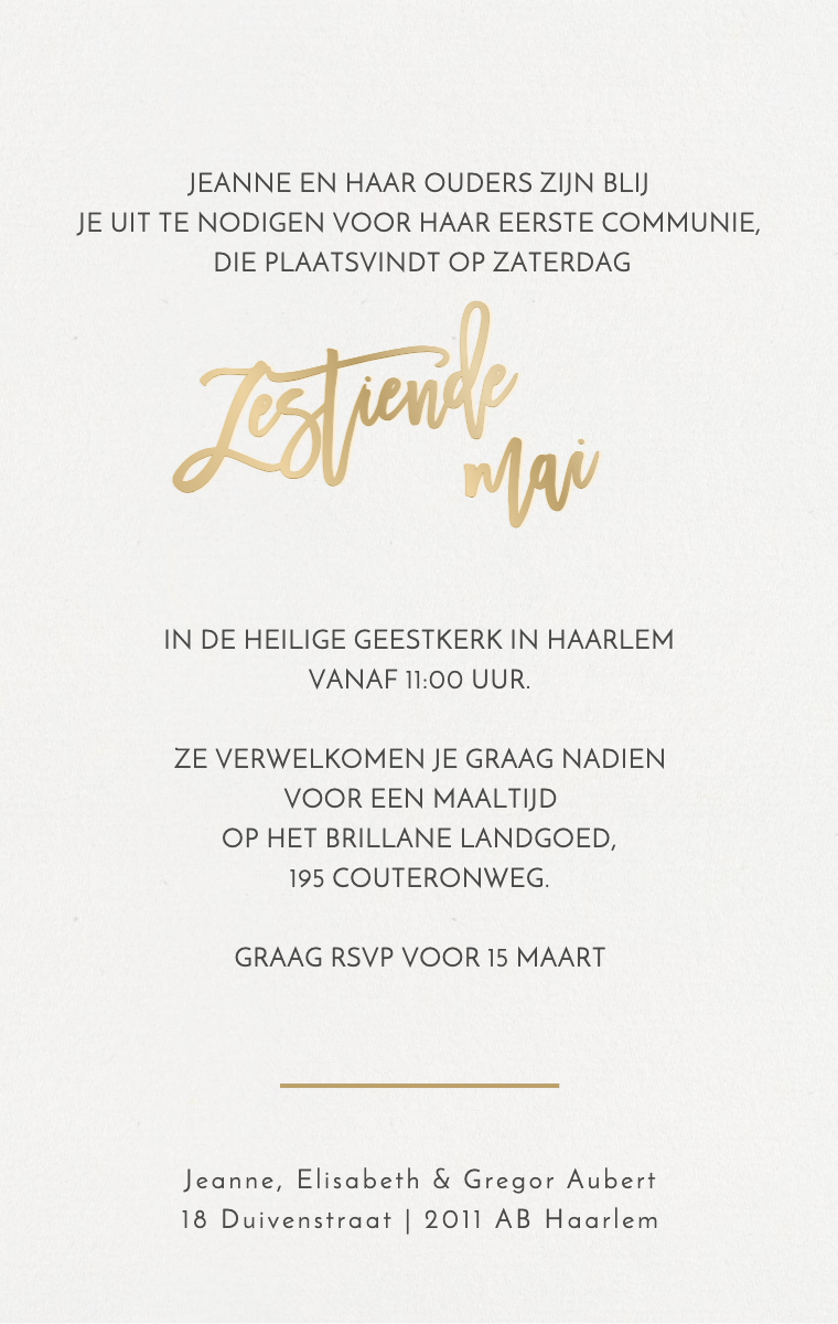 Bereid deze bijzondere viering stijlvol voor! Onze virtuele uitnodigingen zijn ontworpen om de datum van de communie van je kind elegant en gedenkwaardig aan te kondigen. Zorg ervoor dat je dierbaren dit speciale moment nu reserveren met onze gemakkelijk te verzenden en te delen online uitnodigingen.