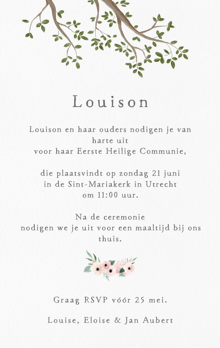Bereid deze bijzondere viering stijlvol voor! Onze virtuele uitnodigingen zijn ontworpen om de datum van de communie van je kind elegant en gedenkwaardig aan te kondigen. Zorg ervoor dat je dierbaren dit speciale moment nu reserveren met onze gemakkelijk te verzenden en te delen online uitnodigingen.