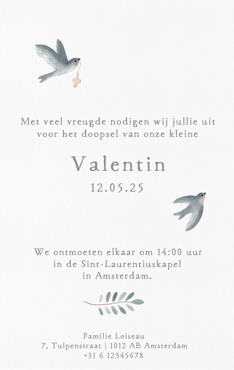 Bereid deze bijzondere viering stijlvol voor! Onze virtuele doopuitnodigingen zijn ontworpen om de datum van de doop van je kind elegant en gedenkwaardig aan te kondigen. Zorg ervoor dat je dierbaren dit speciale moment nu reserveren met onze gemakkelijk te verzenden en te delen online uitnodigingen.